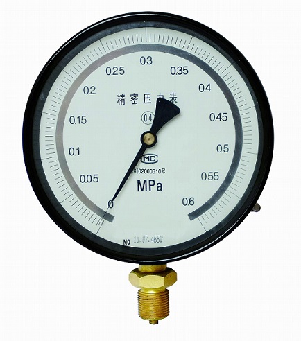 精密压力表的基本结构是由弹性敏感元件、传动放大机构、示数装置以及仪表外壳和接口部件等构成。其工作原理是:当被测介质通过接口部件进入弹性敏感元件(弹簧管)内,弹性敏感元件在被测介质压力的作用下其自由端端会产生相应的位移,相应的位移则通过传动放大机构和示数装置指示出被测介质的压力。