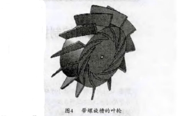 螺旋槽式泵人型气体动压推力轴承是利用“窄槽理论",即假设在两个运动副(一静-动)其中的一个上面雕刻足够多的窄槽,并且槽台与槽之间间隙无限窄,再假设槽内的气体为不可压缩气体,当动运动副转动时使得槽内的气体向槽的中心汇集,槽内气体压力升高,达到所需要的支撑力。根据这一一现象,我们把这种设计与流量计的叶轮相结合,设计出一种能够产生承载力的叶轮(图4),平衡叶轮所受的推力,达到降低流量计固定轴承所受合力的目的。另外,螺旋槽式泵入型气体动压推力轴承的承载力与转速有着一定的联系,随着转速的改变而改变,转速高时,承载力高,转速低时,承载力低,实现了推力自平衡的目的。