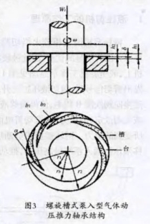 气体涡轮流量计中轴承是在气体润滑理论基础上发展起来的种非接触式轴承,与普通的滚动轴承有着本质上的区别,分为静压式气体和动压式气体轴承。静压式气体轴承是利用外部供气推动气体静压的承载部分,在两个运动副之间产生间隙,达到无摩擦运动。动压式气体轴承不需要外部供气,而是利用其内部的气体,两个运动副之间相对进行转动,依靠转动迫使运动副之间的气体进行压缩,产生支撑承载部分的动力,使两个运动副之间产生间隙,达到支撑的目的。我们在这里所引人的就是一种螺旋槽式泵人型气体动压推力轴承的设计(图3)。