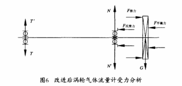 改进后气体涡轮流量计通过自身的调节,依靠不同流量下叶轮转动的速度不同,产生不同的推力,通过这个推力,平衡垂直于叶轮端面的气流推力(图6),使得固定轴承在水平方向上所承受的F反推力有所降低,这样大大改善了固定轴承的受力状况,延长轴承的使用寿命,并且由于轴承的摩擦力减小,轴承的运转精度得到进-步提高,仪表的精度也会提高。