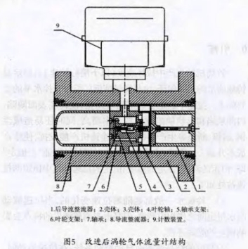 为了满足螺旋槽式泵人型气体动压推力轴承的需要,我们对传统的流量计结构也做了调整(图5),改进后的流量计把原来在导流整流器后的叶轮调整到了叶轮支架后,并且在叶轮后面增加了后导流整流器,其目的主要是为了使叶轮和后导流整流器形成一对运动副,后导流整流器固定不动,叶轮旋转,在叶轮旋转过程中产生动压,形成推力作用。