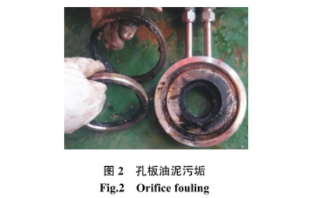 从地层中开采出的原油进人油井计量分离器进行油气水三相分离,这一过程中,当出现天然气气液分离效果不好或分离器内部结构件(波纹板、捕雾器)故障破损时,也会产生不利的影响因素。如:①会使导压管路、测量腔室在长时间使用中产生积水、积油现象,严重的情况下原油中的油泥及颗粒也会进入导压管,发生堵塞,从而影响计取压的准确性,造成计量误差(图2);②在冬季,环境气温较低时,有可能会使积液产生冻堵,此时流量计也不能真实地反映出孔板的前后压差,造成计量数据不准确;③仪表变送器经过长期使用,会发生相应的零点漂移,造成测量数据偏差。
