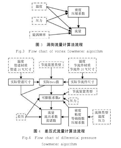 算法流程如图3所示,图中虚线框为外部采集信号,实线框为计算参数;差压式流量计算法流程如有图4所示,图中虚线框为外部信号及已知参数,实线框为计算参数。