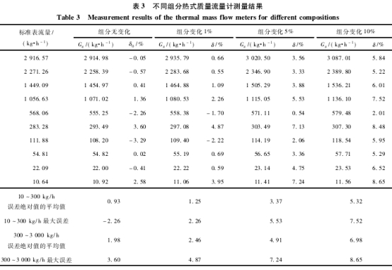 因此,根据表4结果分析,组分变化较大时,产生的附加误差与热式质量流量计自身误差相当或更大,这种情况下由组分变化或设定不准确产生的误差不能忽略不计。本次研究以空气作为介质,热式气体质量流量计为2级的准确度等级,得出在质量流量在300~3000kg/h.时,组分变化达到临界值为3%~4%时其附加误差大于热式气体质量流量计自身的误差,进而对热式测量造成不可忽略的影响;在质量流量在10~300kg/h时组分变化达到临界值4~5%以上会对热式气体质量流量计的测量造成不可忽略的影响,这为实际工程上的应用提供了一定的借鉴。