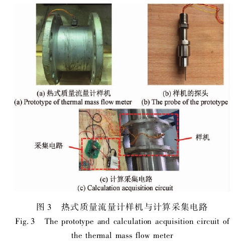 热式气体质量流量计样机如图3(a)所示,内部有测速探头和测温探头,详细的结构如图3(b)所示。该样机信号线外接相应的采集电路,如图3(c)所示,图的左侧为计算采集电路[1849。样机与计算采集电路结构经过多次空气的实流测试,其与标准表的测量误差满足国家JJG1132-2017《热式气体质量流量计检定规程》中的2级的准确度等级,其量程范围为10~3000kg/h,量程比达300:1,根据检定规程10~300kg/h范围内误差为±2%,300~3000kg/h范围内误差为±4%。