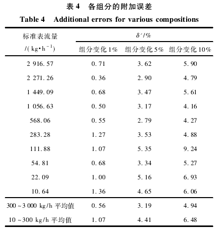 表4为各组分的附加误差,附加误差表示热式气体质量流量计仅由于气体组分的变化对质量流量测量的误差,其定义式为: