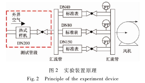 热式气体质量流量计实验测试所用装置是在天津大学流量实验室的气体流量实验装置。实验装置采用微负压法,通过调节风机的频率来调节气体流量。标准表由多路并联的涡轮流量计组成,精度等级为1级,口径分别为40mm、80mm、150mm。实验装置原理如图2所示。