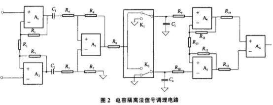 现在很多电磁流量计的信号处理方法采用了电容隔离法,电容隔离法是将零点漂移近似作为直流.处理的一种方法,即通过电容耦合来隔离零点漂移干扰,实现对感应电势信号的提取.放大处理.基本电路如图2.
