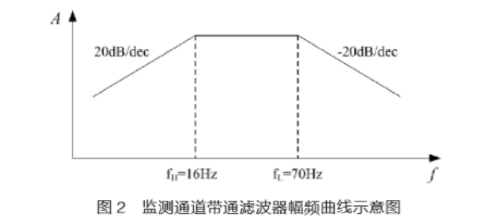 设计了一个由转折频率为fL=fmax/2=70Hz的一阶低通滤波器与转折频率为fH=8*fmin=16Hz的一阶高通滤波器组成的带通滤波器作为“监测通道”。图2为“监测通道”的幅频曲线示意图。