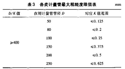 由于标准只对D/K≥400的情况提出了规定,因此现场在用的部分计量管是无法按实际粗糙度进行修正的。就目前采用的积算软件而言,K值最大也只能修正到D/K=400的情况,表3列出了气田内目前常用的几种测量管可以进行修正的粗糙度值。