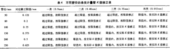 由此可得,川西气田现用的粗糙度修正系数0.15mm不合理,应依据计量管的实际粗糙度情况,并结合标准进行取值。对没有超过限值的按实际K值修正,对超过限值的,按最大限值进行修正。下面(见表4)将给出不同管径的各类计量管应采用的修正值。