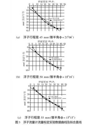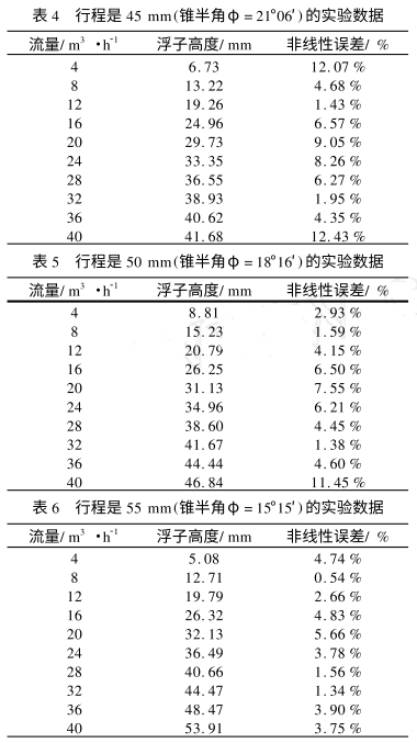 对比.上述两组最大非线性误差和平均非线性误差的数值可以看出,当浮子行程为45mm、50mm,55mm,相应的锥半角为φ=21°06'φ=18°16'φ=15°15'时浮子流量计非线性误差的最大值和平均值也都有了很明显的减小,其中金属管浮子流量计的线性度即最大非线性误差分别为γmax=12.43%γmax=11.45%γmax=5.66%,仪表的线性度得到了很好的.改善.