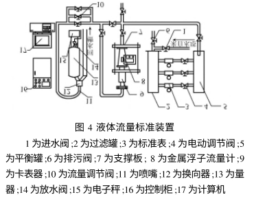 实验中所需流体介质来自高位稳压水塔,流体经过进水阀1进入过滤罐2,3为标准表,可以监视管道中的流量值,电动调节阀4起选通作用,从平衡罐5流出的流体进入金属管浮子流量计8,再经过流量调节阀10从喷嘴11不断向量器13中注入,当量器13中注满流体以后换向器12自动换向,使得从喷嘴11流过来的流体不再进入量器13,而是进入量器13右侧的回水槽,此时电子秤15可以称出量器13中流体的重量,通过计算机17中的程序显示结果可以看到流量值,之后打开放水阀14放水,当量器13中的水全部都放完时,电子秤15清零,换向器12又自动换向到量器13-侧,使得流体不断的注入,准备下一次实验.