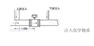 (7)不把流量计安装在被测流体电导率极不均匀的地方。在上游有化学物质注入的情况下,极易导致电导率的不均匀性,从而对流量指示产生严重干扰。在这种 情况下,建议将注入口移到下游管道。如果必须从流量计上游注入化学物质,则 流量计应尽量远离注入口(一般在20D以上),以保证液体充分混合均匀。