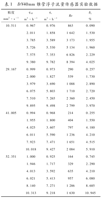 对量程范围1~10m³/h、精度等级1.5级的DN40mm浮子流量传感器进行实验研究。qxo是刻度流量,qvomax为流量传感器量程上限,qv是实际流量,δ1是满度误差,δ1=|(qy0-qy)1/qxomax100%,实验数据见表1。