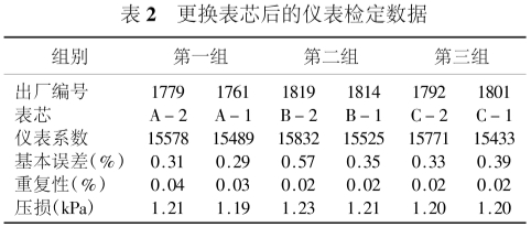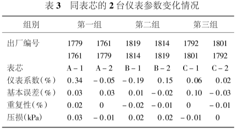 将每组仪表的2台表芯对换,重新进行检定,获取检定数据,列于表2。将同表芯的2台仪表参数进行比较,获得比对结果,列于表3。其中仪表系数以相对变化(百分数)表示。