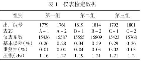 按照规定,涡轮流量计出厂前总是逐台进行标定,并给出仪表系数。但在现场,尤其是高压场合,涡轮表损坏的事时有发生,维修人员经常将表芯(包括叶轮和轴承在内的组件)更换,而不是整台仪表更换,换下的表芯带回维修(在现场不允许进行长时间的维修工作)。由此产生了这样的疑问:整台仪表更换与只更换表芯在流量计的性能方面,尤其是仪表系数会有什么变化?仪表系数究.竟和哪些因素有关?带着对这些问题的思考,我们随机抽取了6台仪表(口径均为DN80),每两台仪表组成一组,共3组进行对比试验。6台仪表检定数据列于表1。
