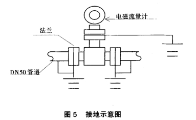 电磁流量计是基于导电性流体在磁场中运动所产生的感应电动势来推算流体流量的测量仪表,其基本工作原理是电磁感应定律。因此电磁耦合、静电感应是电磁流量计干扰噪声的首要来源,在管线上存在杂.散电压干扰。为了保证液体与地同电位,避免液体与.地有电位差以及因空间电磁干扰而造成的测量误差,所以,对接地做了严格的要求。本装置与管道为固定法兰连接,固定法兰和管道以及流量传感器均用2.5mm2的铜芯线作了良好的接地见图5。