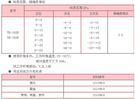仪表由测量系统(包括接头、膜盒等)、传动机构、指示装置和外壳组成。导压系统及外壳均用不锈钢材料制成,采用密封型结构,防止污秽物侵入。