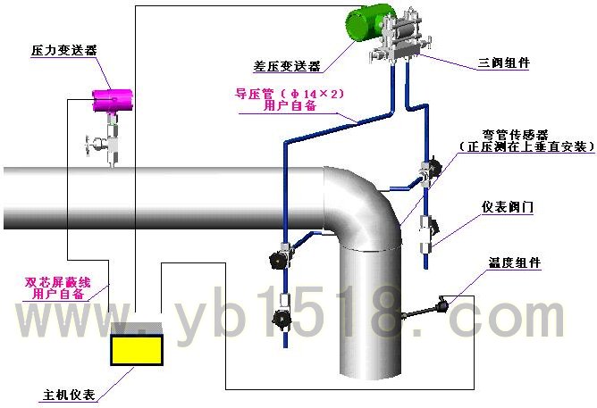 弯管流量计系统构成常用的系统构成见下图:(安装图以垂直安装,正压测在上)