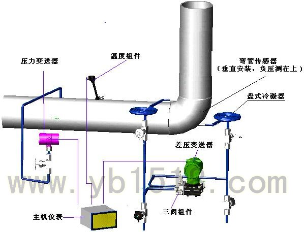 弯管流量计的一次传感元件——弯管传感器依安装管线上的不同分为如下三种: